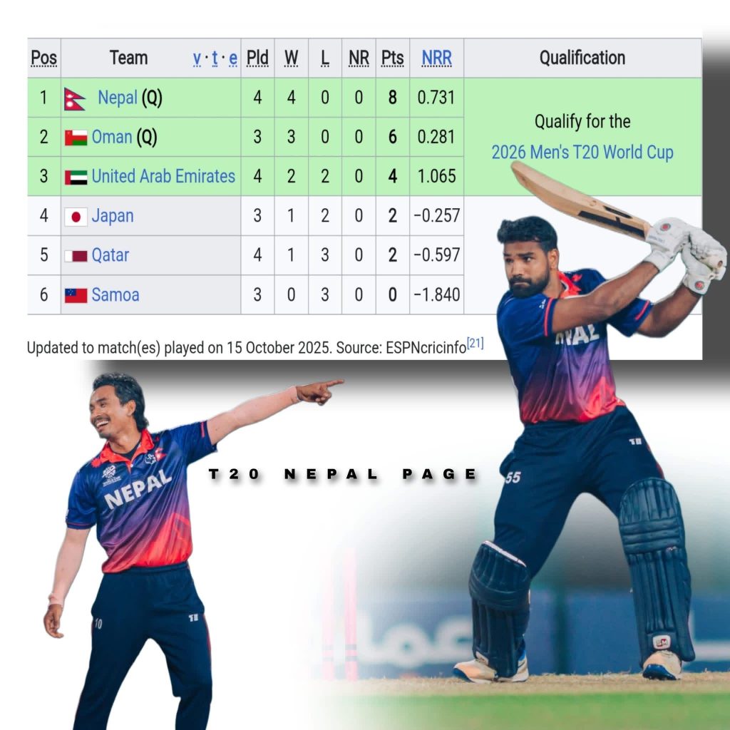 नेपालले ८ अंक जोड्दै शीर्ष स्थानमा उक्लिएको छ । नेपालसंग पराजित ओमन ६ अंकसहित दोस्रो स्थानमा झरेको छ ।